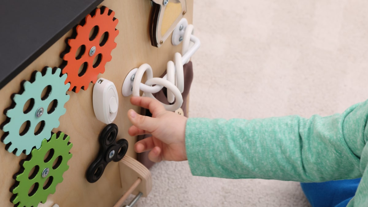 Une fois le principe clarifié, si un parent souhaite créer ou acheter un matériau pour la stimulation tactile, manuelle ou sensorielle de son enfant, il pourra opter pour une surface de forme géométrique simple (carrée, ronde, rectangulaire, triangulaire) sur laquelle fixer des objets aux couleurs neutres et d’une consistance intéressante d’un point de vue sensoriel (métal, cuir, bois…) avec laquelle l’enfant pourra affiner ses compétences manuelles (par la fermeture d’un cadenas, d’une serrure, d’un interrupteur…).