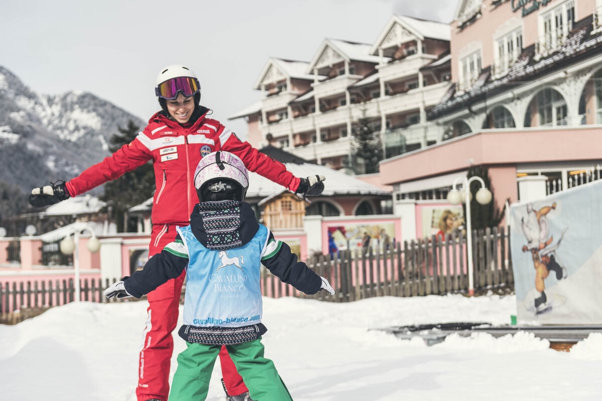 L’école de ski de l’hôtel Cavallino Bianco accueille les enfants à partir de 3 ans et se distingue par la grande attention portée aux plus petits. La première approche de ce sport peut se dérouler à l’intérieur de la structure sur des tapis en caoutchouc souple, où ils pourront expérimenter en toute sécurité les positions (et les glissades !) tout en s’amusant.